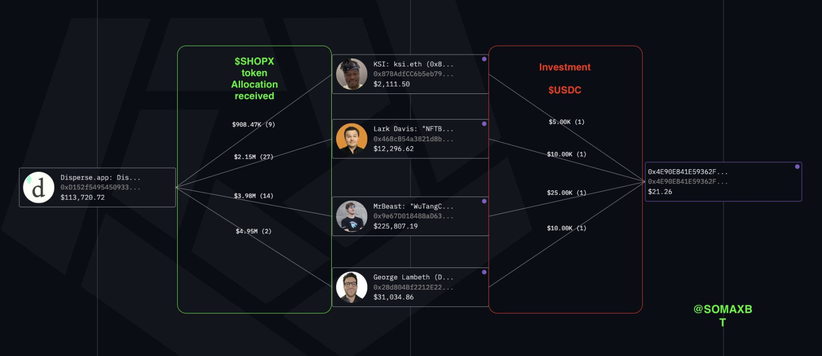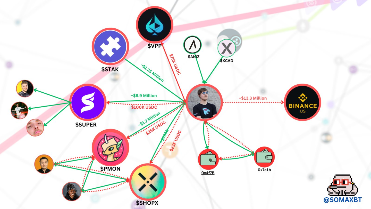 Según SomaXBT, MrBeast invirtió 100 000 dólares en el proyecto y recibió 1 millón de tokens SUPER. Tras su inversión, el precio del token se disparó y, el 30 de marzo de 2021, MrBeast transfirió sus tokens SUPER a una billetera de respaldo, donde fueron vendidos mediante una serie de transacciones que sumaron 1 900 ETH (unos 3,7 millones de dólares en ese momento). MrBeast recibió tokens SUPER adicionales bajo un contrato de vesting y posteriormente los vendió por 5,5 millones de dólares, elevando sus ganancias totales del proyecto a aproximadamente 9 millones de dólares.