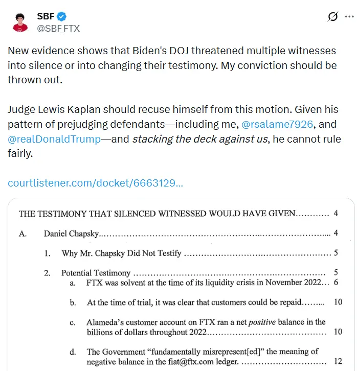 Según ChainCatcher news, la cuenta SBF (@SBF_FTX) X publicó que nuevas pruebas muestran que el Departamento de Justicia de la administración Biden ha amenazado a varios testigos para obligarles a guardar silencio o cambiar su testimonio.