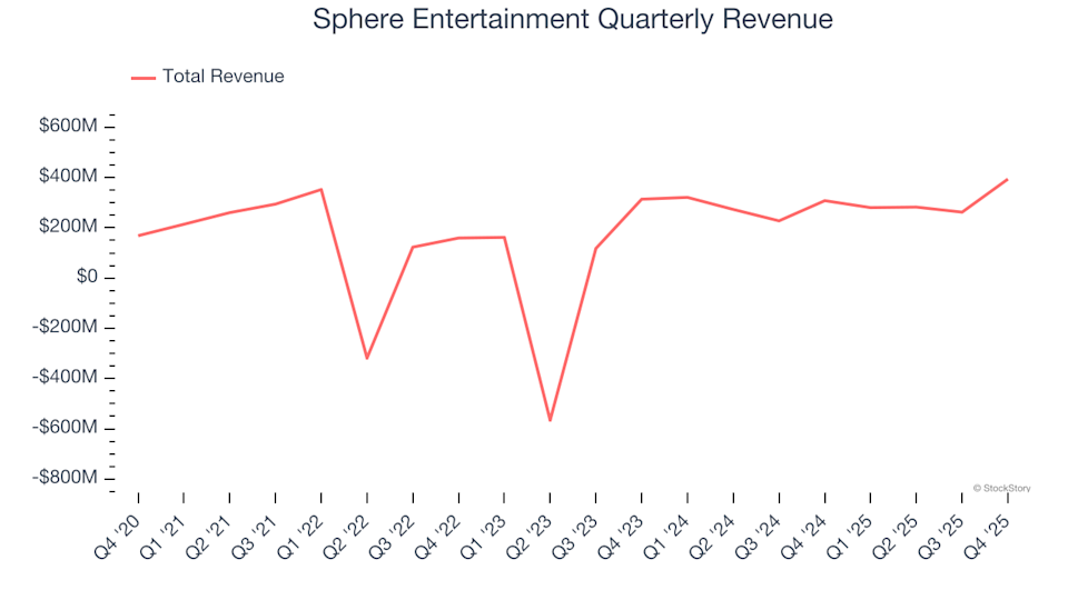 Empresa de producción y distribución de contenido Sphere Entertainment (NYSE:SPHR) reportó resultados del cuarto trimestre del año calendario 2025 que superaron las expectativas de ingresos del mercado, con ventas que aumentaron un 27.9% interanualmente hasta 394.3 millones de dólares. Su beneficio GAAP de 1.23 dólares por acción estuvo significativamente por encima de las estimaciones consensuadas de los analistas.
