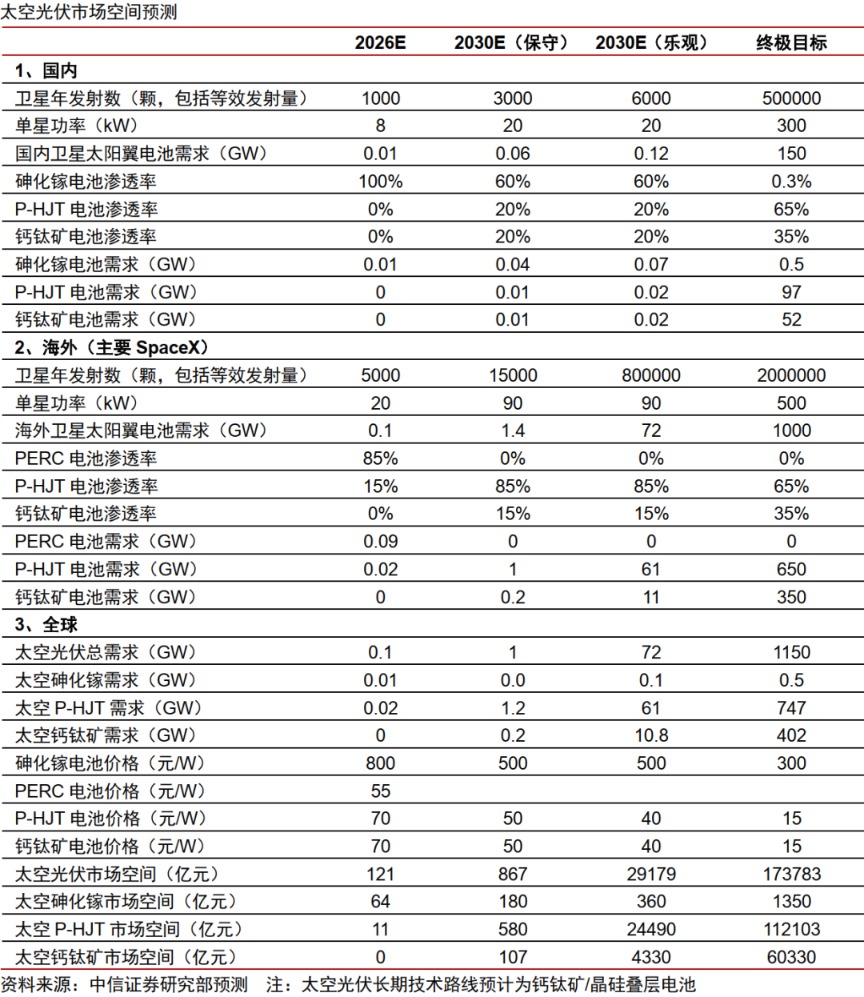 SpaceX mène le développement de l’aérospatiale commerciale, accélère la construction de Starlink et la mise à niveau des satellites, et prévoit de déployer un million de satellites, entrant officiellement dans le domaine des centres de données spatiaux. Le photovoltaïque spatial est actuellement la seule source d’énergie pour les satellites et la puissance orbitale, et sa croissance en demande et en marché pourrait connaître une expansion exponentielle. Selon nos estimations, dans un scénario prudent, la demande mondiale en photovoltaïque spatial pourrait atteindre 1 GW et un marché de plus de 80 milliards de yuans d’ici 2030 ; dans un scénario optimiste, ces chiffres pourraient atteindre 70 GW et près de 3 trillions de yuans. Nous prévoyons qu’au cours des cinq prochaines années, le marché des batteries HJT de type P et des cellules à pérovskite pourrait croître de plusieurs centaines, voire milliers de fois.