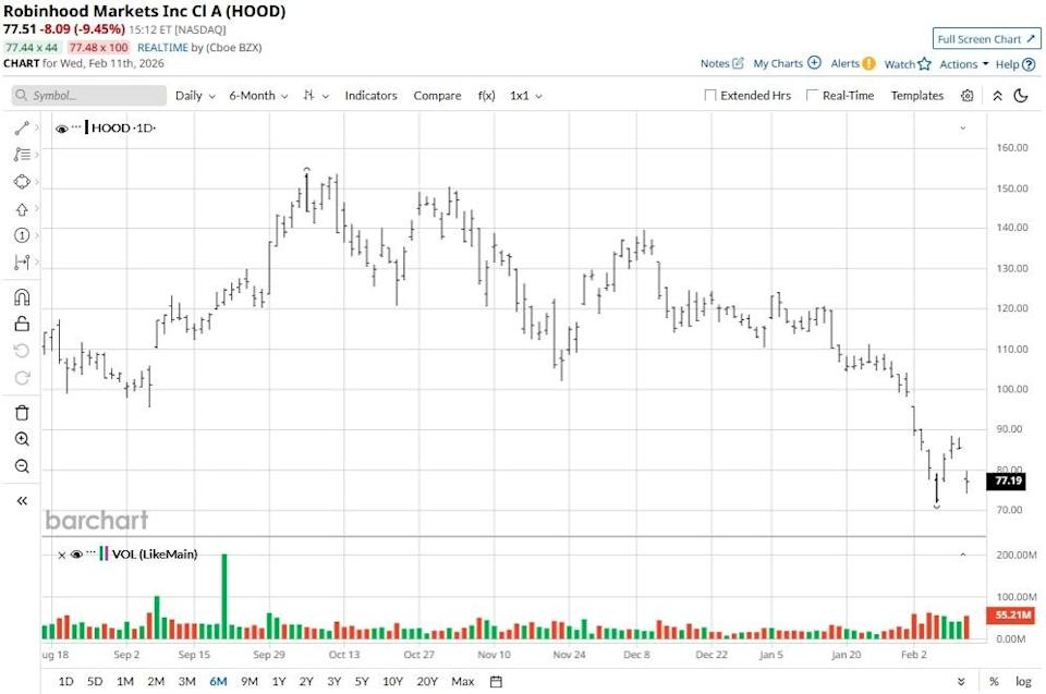 Saham Robinhood (HOOD) anjlok lebih dari 10% pada 11 Februari, setelah perusahaan fintech tersebut melaporkan pendapatan yang lebih rendah dari perkiraan pada kuartal keempat tahun 2025.