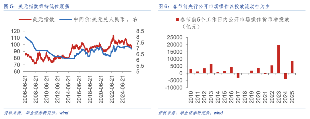 Likuiditas selama Tahun Baru Imlek kemungkinan tetap longgar. (1) Likuiditas makro selama liburan kemungkinan tetap longgar: pertama, dari luar negeri, data CPI AS Januari akan diumumkan 11 Februari, data ritel Januari akan dirilis 17 Februari, diperkirakan indeks dolar AS akan tetap rendah, sehingga pengaruh terhadap kebijakan Federal Reserve terbatas; kedua, indeks dolar kemungkinan tetap rendah, pembatasan likuiditas dari luar negeri terbatas. Kedua, dari dalam negeri, sebelum liburan, Bank Sentral kemungkinan meningkatkan penyaluran bersih likuiditas karena ketatnya likuiditas musiman; juga, ada ruang untuk pelonggaran kebijakan seperti penurunan suku bunga dan rasio cadangan. (2) Dana pasar saham sebelum liburan tetap stabil, setelahnya kemungkinan meningkat cepat. Pertama, berdasarkan pengalaman masa lalu sejak 2015, selama 11 tahun, 8 kali dana asing masuk bersih dalam 5 hari perdagangan sebelum liburan, meskipun selama 5 hari setelahnya dana masuk bersih 9 kali dan dana pinjaman juga meningkat, menunjukkan koreksi sementara. Kedua, tahun ini, meskipun dana pinjaman mungkin sedikit keluar sebelum liburan, kondisi likuiditas domestik dan internasional yang longgar serta katalis industri teknologi mendukung sentimen pasar tetap stabil, sehingga dana pasar saham tidak akan turun secara signifikan, dan setelah liburan, dana dari luar negeri, dana baru, dan dana dari reksa dana kemungkinan kembali masuk.