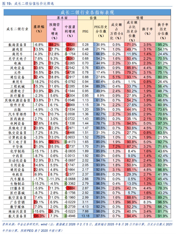 Valuasi sektor sekunder dalam bidang mobil, perangkat medis, dan farmasi kimia juga rendah, dengan sentimen pasar yang lemah. Sektor seperti layanan mobil, kendaraan penumpang, alat kesehatan, dan farmasi kimia memiliki PEG yang rendah, masing-masing 0.28, 0.48, 0.62, dan 0.68, serta volume transaksi mereka di posisi rendah dalam distribusi historis, masing-masing 0.5%, 1.1%, 5.7%, dan 8.4%.