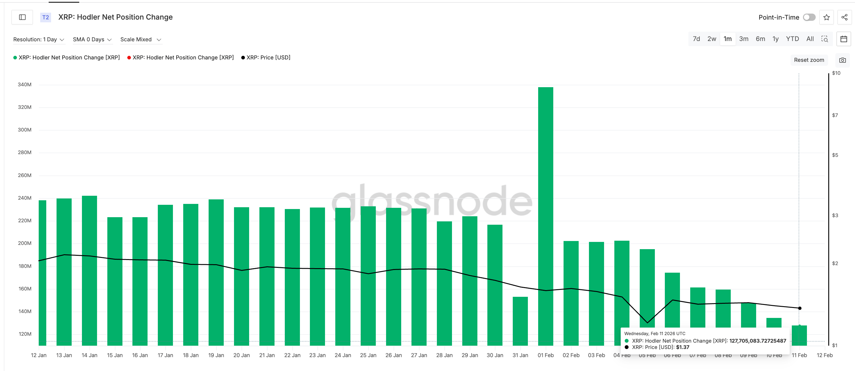 さらに懸念すべきは、長期保有者(ウォレットの保有期間>155日)の行動変化です。このグループは2月1日時点では毎日3.37億枚のXRPを増持していましたが、2月11日にはこの数値が1.28億枚に減少し、62%の縮小を示しています。これは、テクニカル面で楽観的なシグナルが出ているにもかかわらず、市場サイクルを最も理解している資本が積極的に参加していないことを示しています。