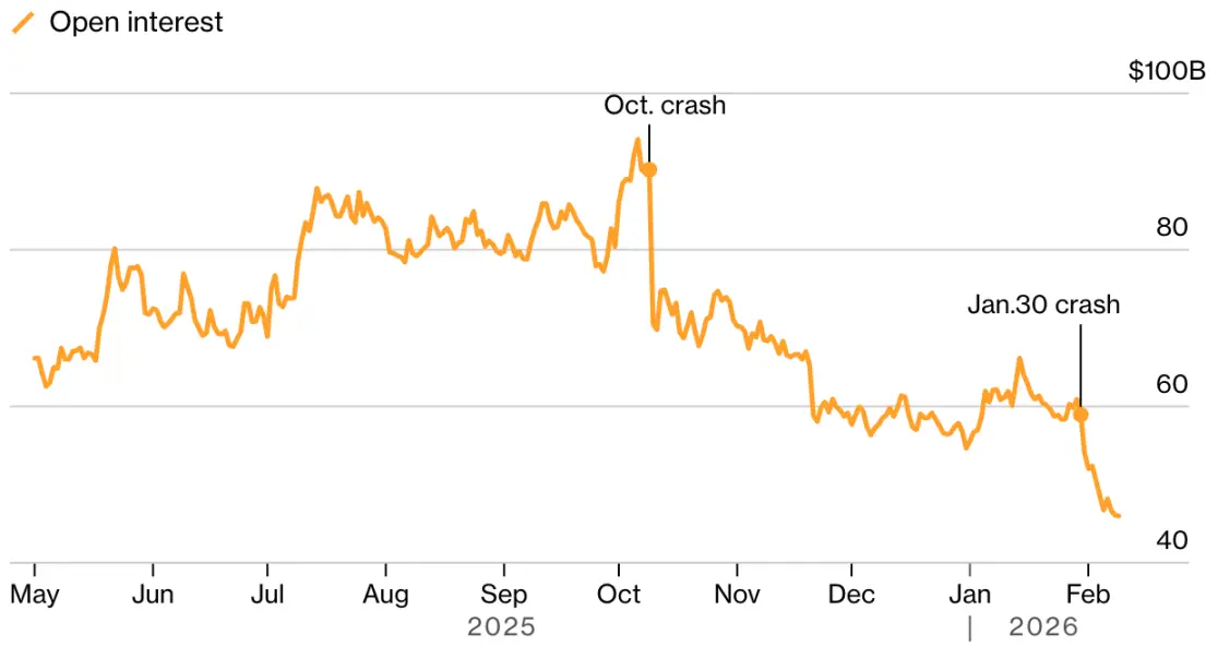 ビットコインの永続先物の未決済契約は昨年10月以降下落を続けており、反発の兆しは見られません。Coinglassのデータによると、10月の高値から約50%下落しています。