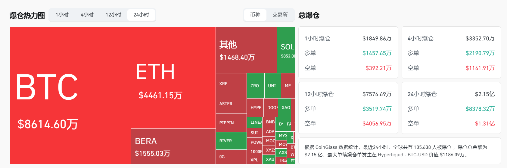 ビットコイン(BTC)の清算額は8614.60万ドル、イーサリアム(ETH)は4461.15万ドルだった。過去24時間で合計105,638人が清算され、その中で最大の単一清算はHyperliquidのBTC-USD取引ペアで、価値は1186.09万ドルだった。