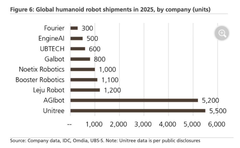 瑞銀の統計によると、**2025年の世界の人型ロボット出荷台数は約1.86万台であり、中国企業が主導的なシェアを占めています。**その中で、ユニトリー(Unitree)とアジボット(AgiBot)がそれぞれ約5000台を出荷し、両者合わせて約1万台を占めており、世界総数の半数以上を占めています。これは、中国企業が商用化段階で先行優位を築いていることを示しています。