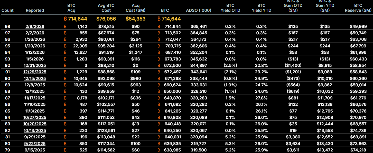 De acordo com dados do site oficial, o custo médio (Avg Cost) do Bitcoin para a MicroStrategy é de 76.056 dólares, enquanto o custo de aquisição (Acq Cost) é de 54.353 dólares.