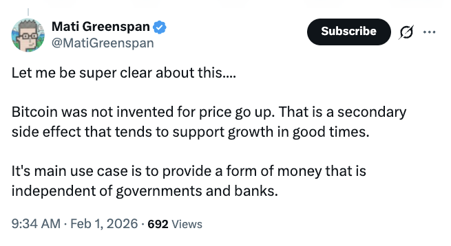 Lastly, an interesting perspective comes from industry insiders. Mati Greenspan, CEO of Quantum Economics, reminds us that perhaps we’ve been focusing on the wrong thing all along. He wrote on social media that Bitcoin’s core design goal is to be a currency independent of the traditional banking system; price appreciation is merely a potential “side effect,” not its primary purpose. This viewpoint is like a cold shower, prompting us to think: when the market only focuses on price swings, has it already strayed from its original vision?