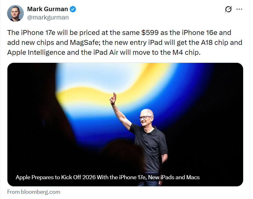 Nhà báo kỳ cựu của Bloomberg, Mark Gurman, trên mạng xã hội cho biết, phản hồi từ nhân viên bán lẻ của Apple cho thấy tồn kho iPhone 16e đã gần như cạn kiệt, iPad Air cũng đang gặp khó khăn về nguồn cung. Hiện tượng này thường báo hiệu Apple đang chuẩn bị mở rộng kênh phân phối cho sản phẩm mới, dự kiến iPhone 17e và iPad Air M4 sẽ ra mắt trong vài tuần tới.
