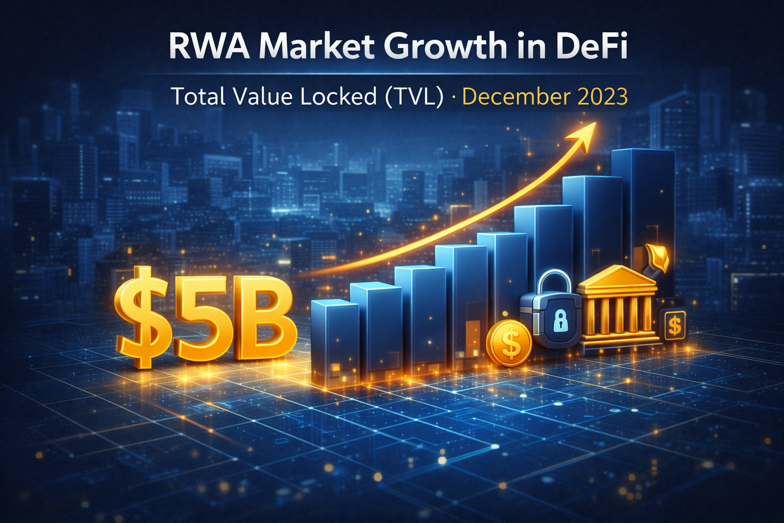 从当前发展来看,RWA 市场已进入实质性增长阶段。截至 2023 年 12 月,去中心化金融(DeFi)生态中与 RWA 相关的总锁仓价值(TVL)约为 50 亿美元,并呈现持续扩张趋势。这一数据表明,RWA 已从概念验证阶段,逐步迈向实际应用落地。