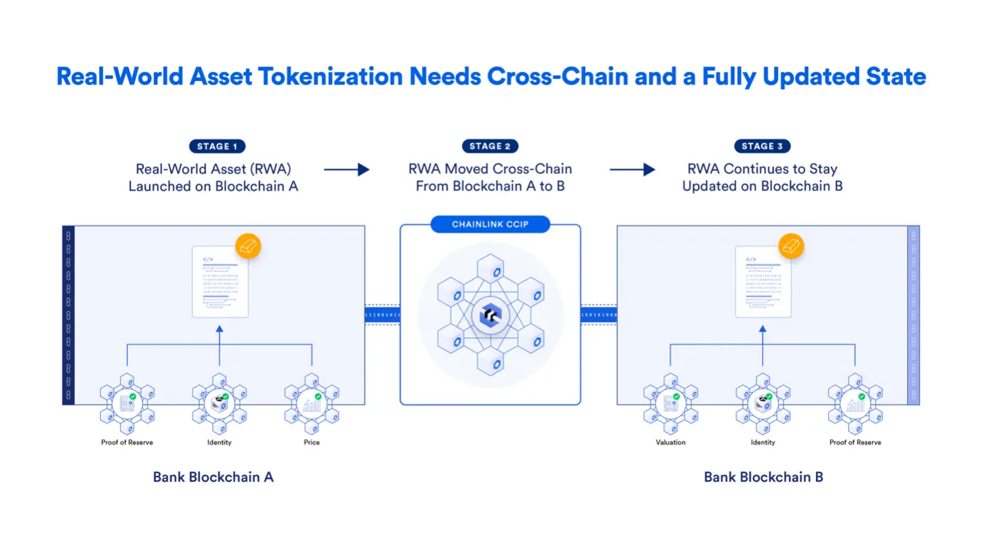 随着行业成熟,跨链互操作性协议 正逐渐取代传统跨链桥,成为连接 TradFi 与区块链的新标准。以 Chainlink 推出的跨链互操作性协议(CCIP)为代表,该类协议为 RWA(现实世界资产)代币提供了统一、安全的发行与跨链转移框架,使资产能够在不同区块链生态之间无缝流通,同时降低系统性风险。